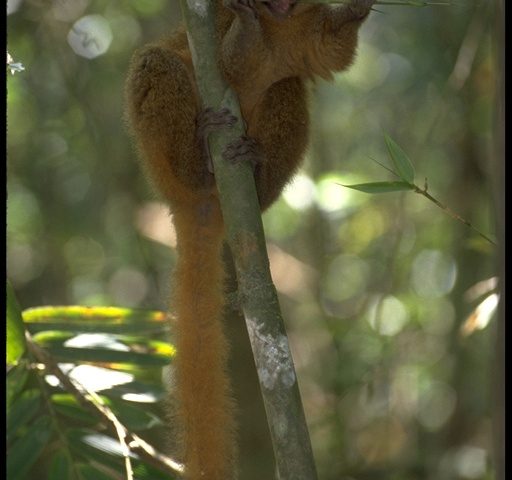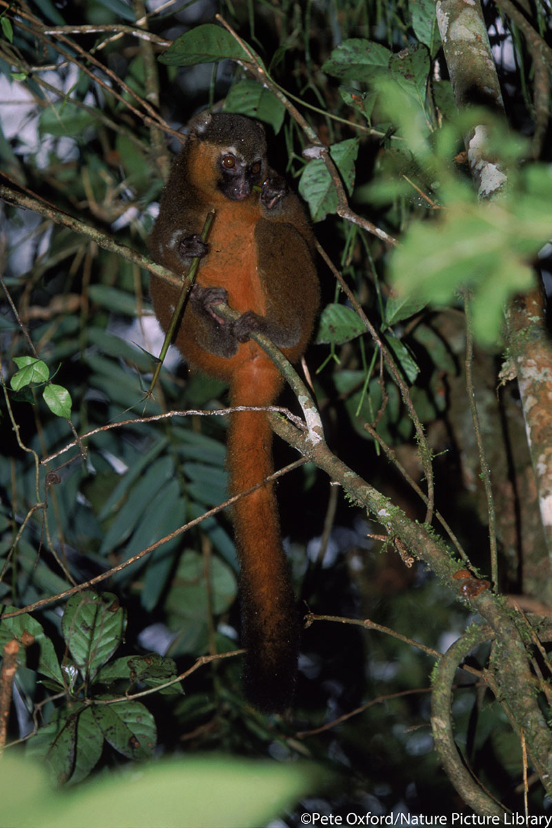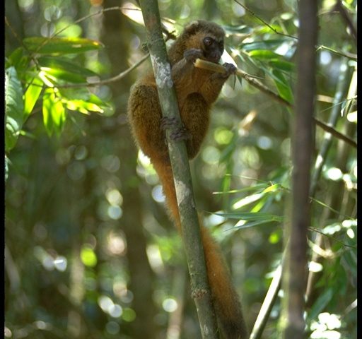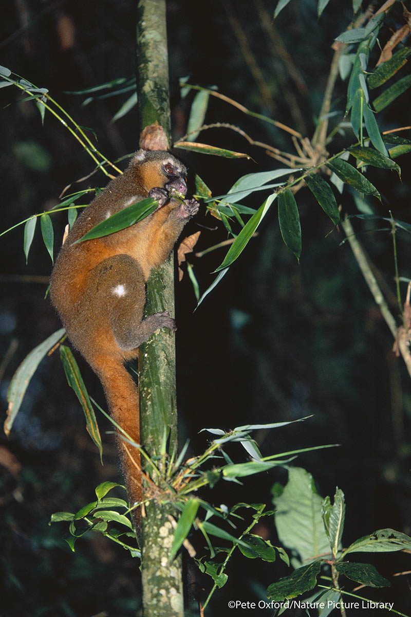 It was first described by Western science 30 years ago, in 1987. Bamboo lemurs are a genus of 5 species, and are the only primates in the world that specialise on a bamboo diet. Every day the golden bamboo lemur eats around 500g of soft stalks and growing tips of giant bamboo, which represents 12 times the lethal dose of cyanide for most mammals. This species has evidently adapted and evolved resistance to the high levels of cyanide within the young bamboo leaves that it eats. Lemurs are the most basal living primates, deriving from a lineage that has independently evolved on the island of Madagascar for 50-60 million years; forming five distinct families of lemur. The golden bamboo lemur comes from the Lemuridae family, and are in the Hapalemur genus with five other species. The species is threatened primarily by the continued loss of its forest habitat due to slash-and-burn agriculture and destruction of bamboo forests for building houses, carrying water, making baskets and other local uses, though they suffer from some hunting pressure.